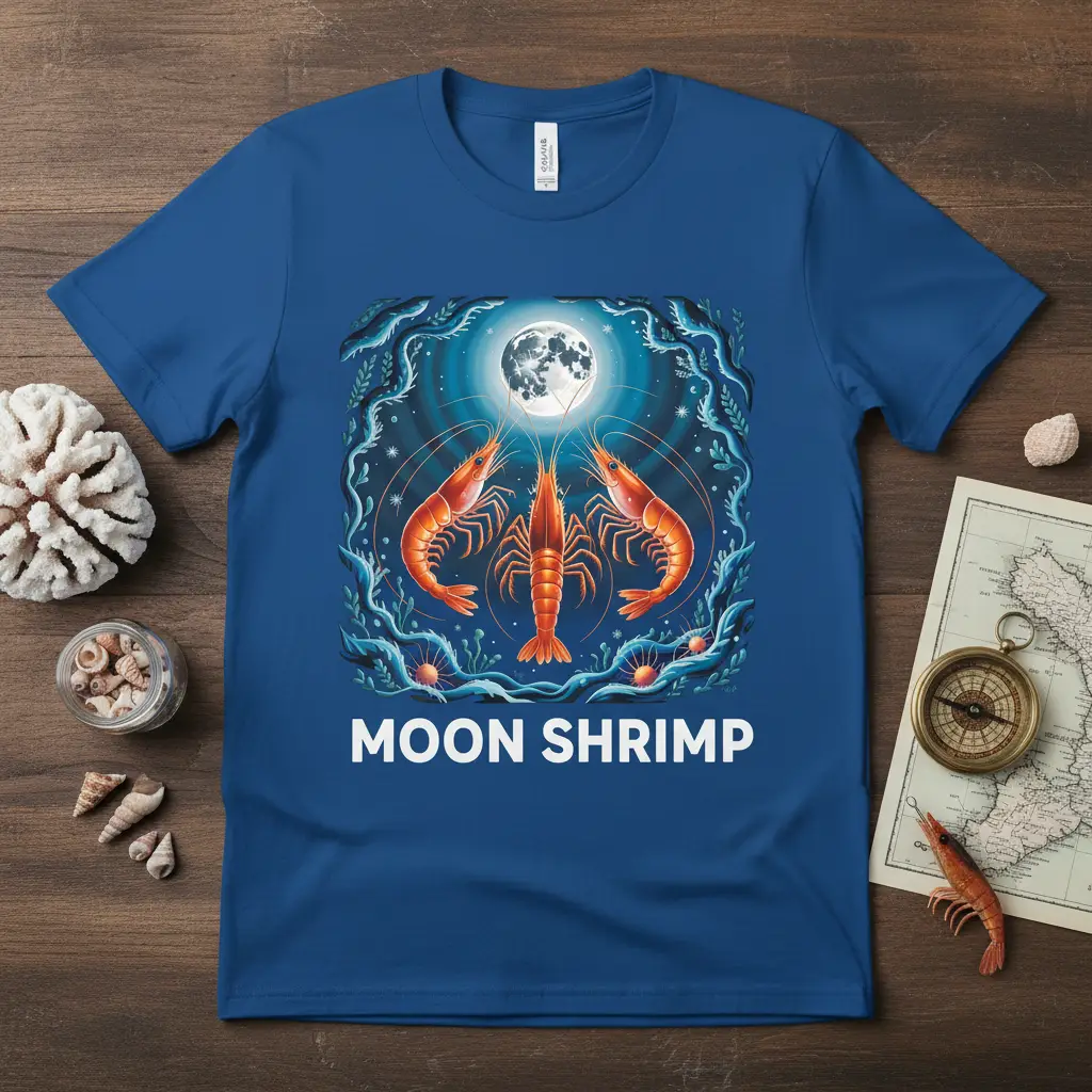 The combination of shrimp and the moon creates a whimsical yet intriguing theme. It appeals to a broad audience, from marine biology enthusiasts and seafood lovers to individuals who appreciate unique, nature-inspired graphics. This design is more than just apparel; it’s a statement of quirky taste and appreciation for the extraordinary.