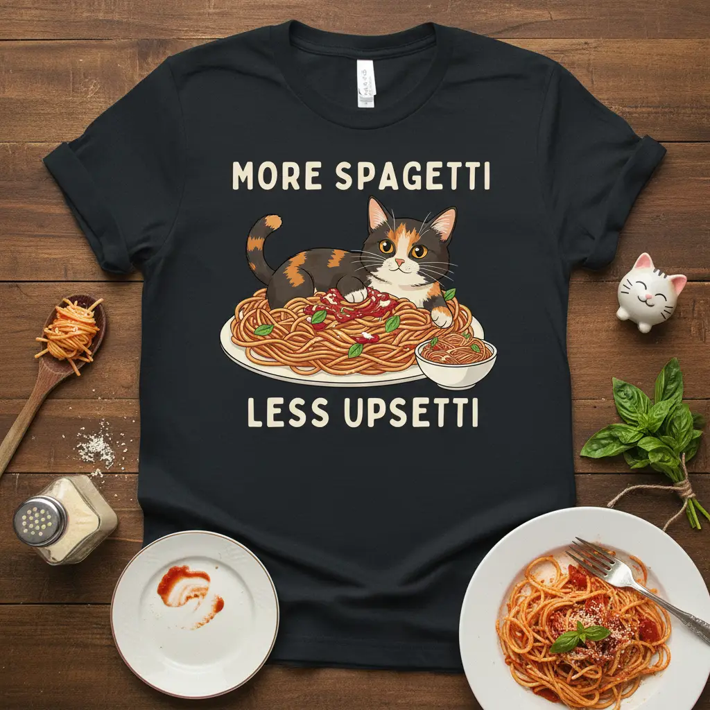 MORE SPAGETTI LESS UPSETTI adorns this unique t-shirt, celebrating the simple pleasures of life: delicious pasta and adorable cats. This design is perfect for anyone who believes that more food and fewer worries are the recipe for happiness. It captures the essence of comfort and joy, making it an ideal addition to your casual wardrobe or a thoughtful gift for a fellow food lover. The playful message is sure to bring smiles and start conversations wherever you go.