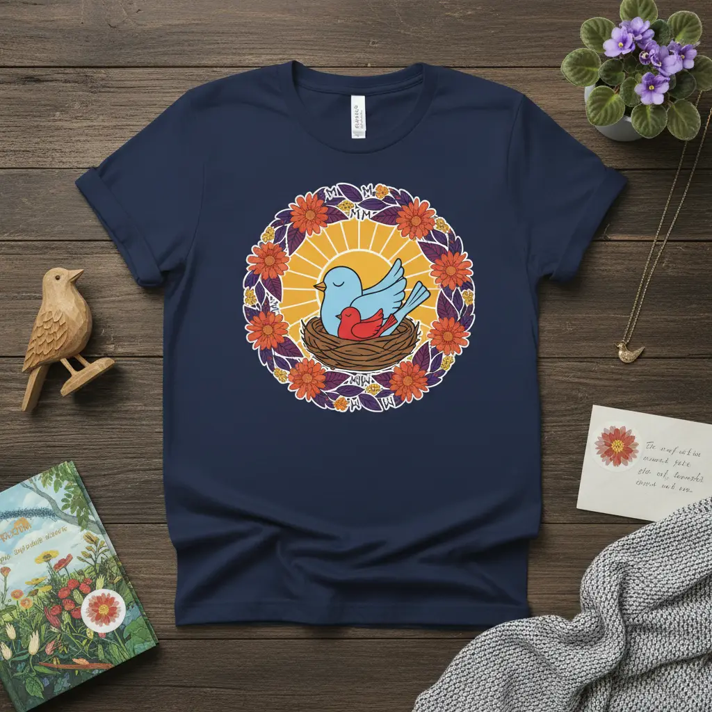 The visual narrative of the design evokes feelings of peace, security, and unconditional love. It’s a reminder of the simple yet profound connections that enrich our lives. Whether you’re a bird enthusiast, a proud parent, or simply someone who appreciates thoughtful artwork, this t-shirt offers a unique way to share your passions and values. The careful attention to detail in the illustration ensures that every element, from the texture of the nest to the delicate petals of the flowers, contributes to the overall charm and appeal.