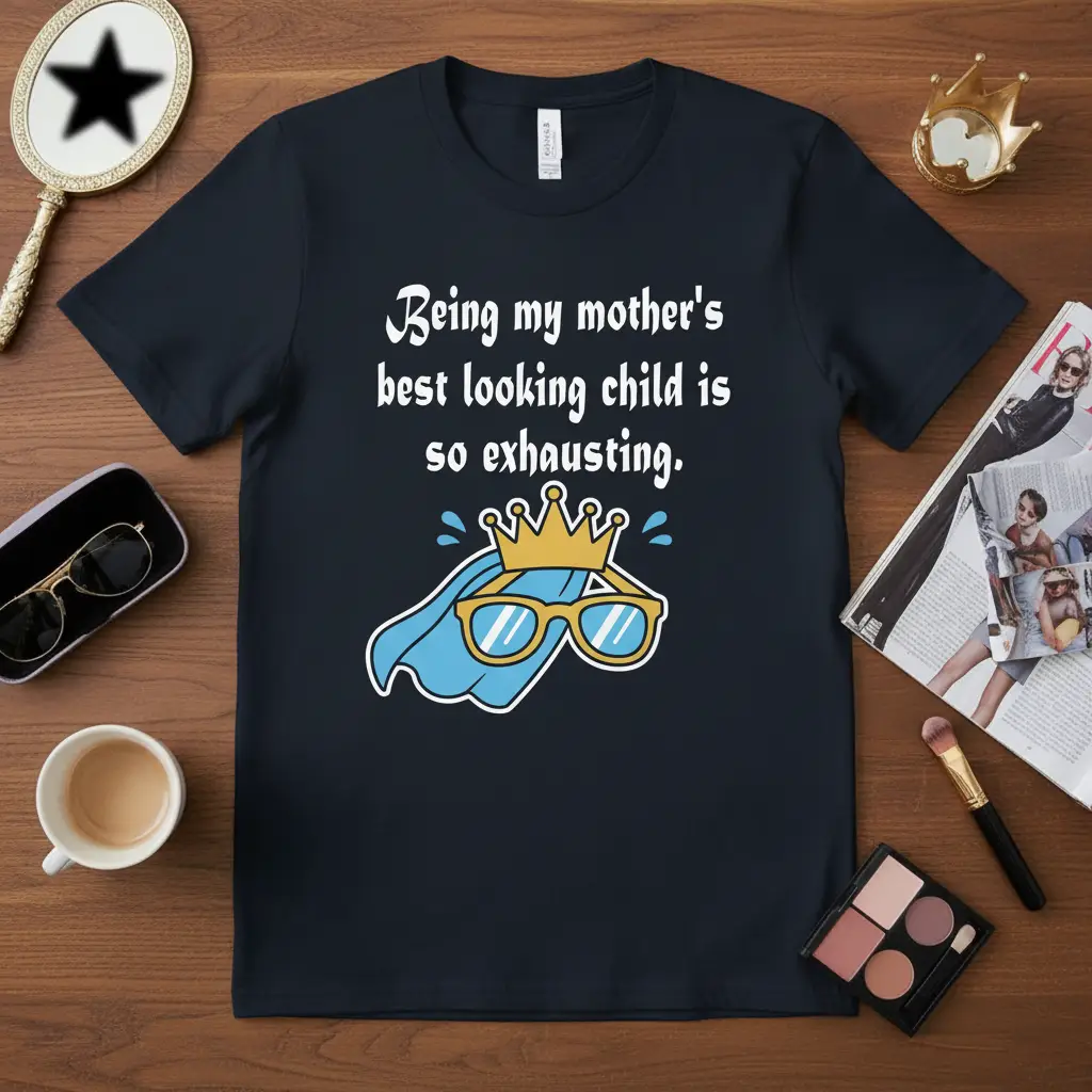 This shirt speaks volumes for those who have always been the apple of their mother’s eye. The witty phrase, “Being my mother’s best looking child is so exhausting,” is printed in an eye-catching font that commands attention. It’s a playful nod to family dynamics and the subtle competition that can sometimes exist, all in good fun.