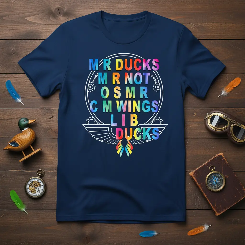 This design is crafted for those who appreciate originality and a good sense of humor. The “Mr Ducks Mr Not Osm R CmWings Lib Ducks” text is rendered in a playful, multi-colored font that catches the eye. Accompanying graphics, like the circular emblem and wings, add depth and visual interest to the overall composition. It’s a conversation starter that reflects a fun-loving attitude.