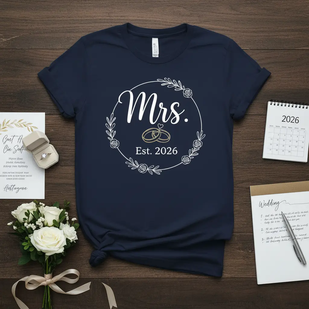 This “Mrs. Est. 2026” t-shirt is the ultimate way to showcase your excitement and pride as you embark on married life. The design is thoughtfully crafted to be both elegant and celebratory, featuring a delicate floral wreath encircling the words “Mrs.” and “Est. 2026.” Intertwined wedding rings, a timeless symbol of eternal love, are placed above the year, further enhancing the romantic aesthetic. It’s perfect for engagement parties, bridal showers, bachelorette weekends, or even as a casual wear option post-wedding.