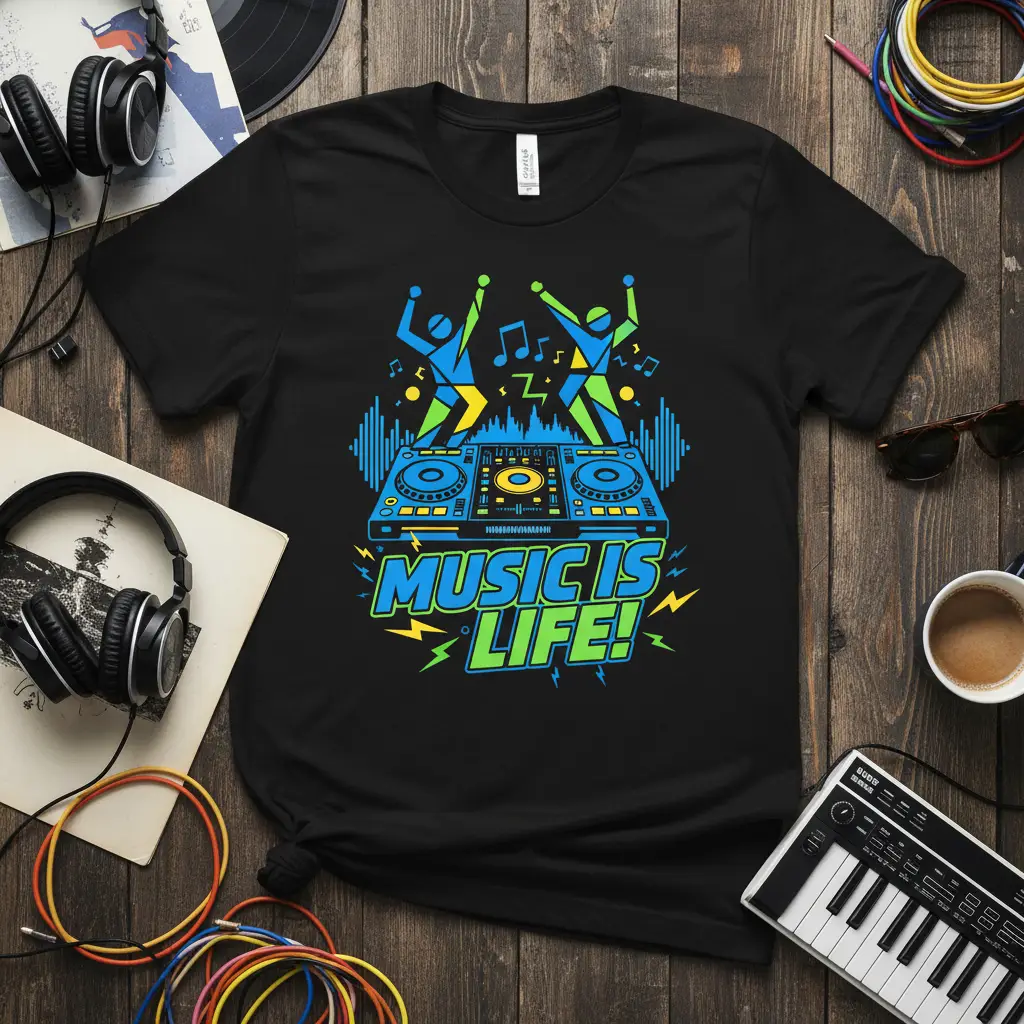 This eye-catching t-shirt features the bold phrase “MUSIC IS LIFE!” in a dynamic, electric font. The design is amplified by a detailed illustration of DJ turntables, complete with pulsating sound waves and energetic dancing figures. This combination creates a powerful visual that resonates deeply with anyone who feels the pulse of the beat. It’s more than just a graphic; it’s an anthem for everyone whose life revolves around music.