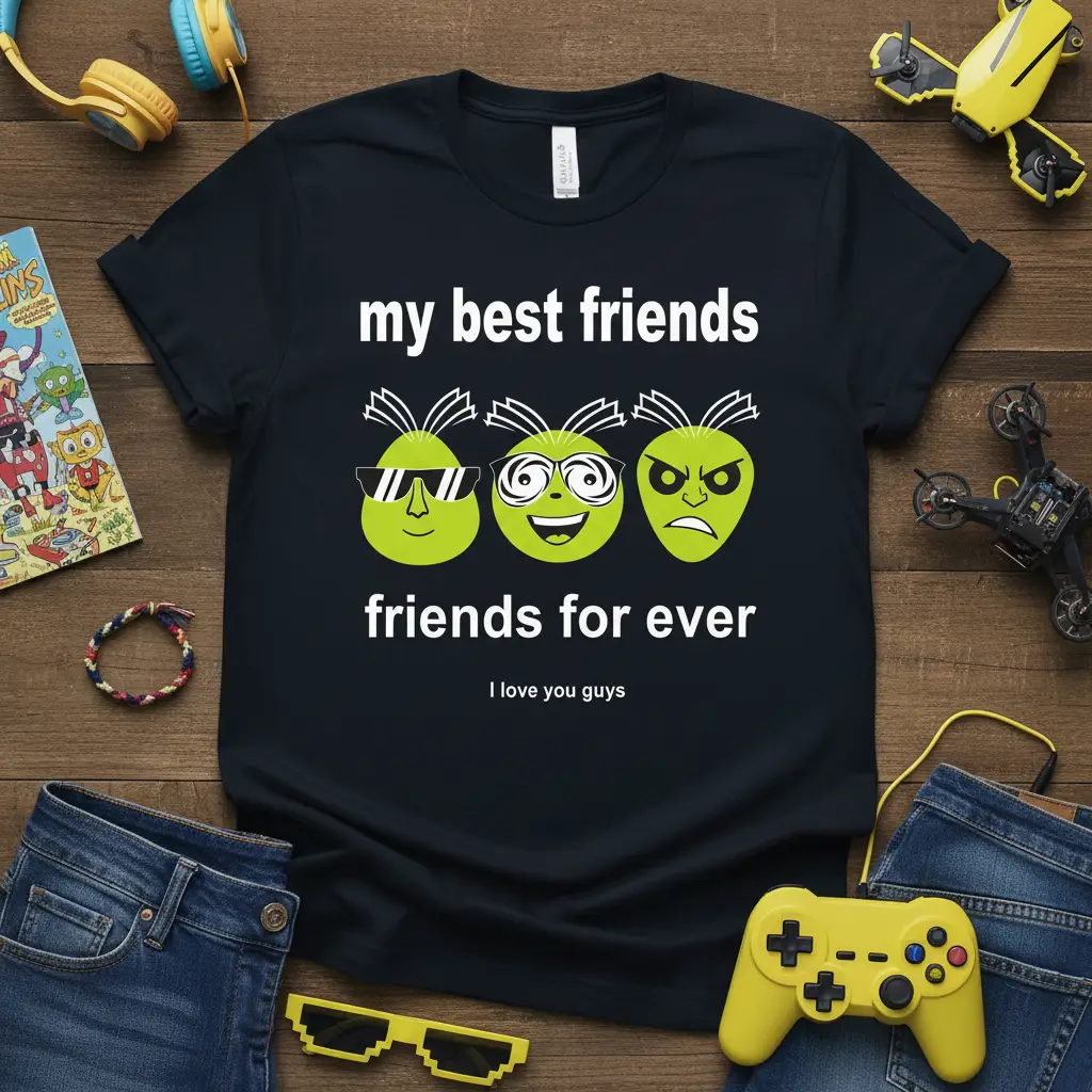 This t-shirt proudly displays the heartwarming message “my best friends friends for ever,” creating a powerful visual representation of lasting camaraderie. The accompanying phrase, “i love you guys,” adds a personal and affectionate touch, making it ideal for expressing gratitude to your closest circle. The design features three distinct green characters, each with a unique personality reflected in their expressions, symbolizing the diverse yet unified nature of strong friendships.