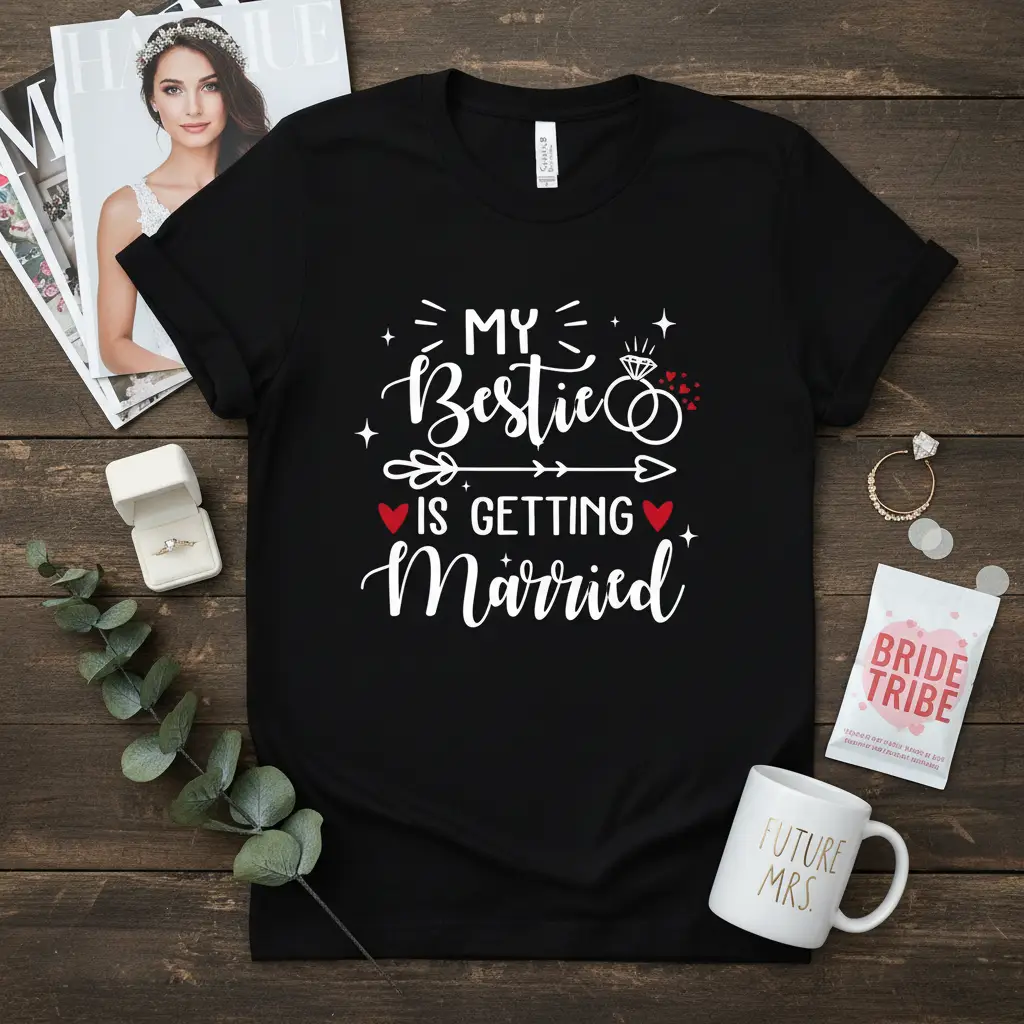 The phrase “My Bestie Is Getting Married” is rendered in a beautiful, flowing script that is both elegant and fun. This design is meant to be shared and celebrated, symbolizing the strong bond between friends as one embarks on a new chapter. It’s a lighthearted and stylish way to show you’re part of the wedding journey.