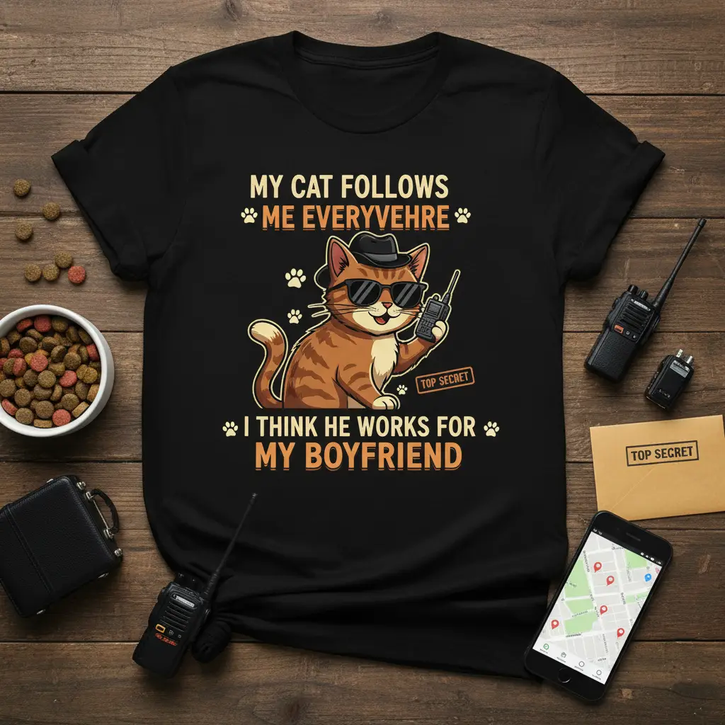 MY CAT FOLLOWS ME EVERYVEHRE I THINK HE WORKS FOR MY BOYFRIEND – My Cat Follows Me Everyvehr I Think He Works For My Boyfriend T-Shirt is the ultimate expression of humor and affection for cat lovers and their partners. This unique design captures the playful suspicion many pet owners have about their feline friends’ secret lives. It’s a conversation starter that will undoubtedly bring smiles and laughter to anyone who sees it. The witty quote paired with a charming, spy-themed cat graphic makes this tee a standout piece in any casual wardrobe, perfect for expressing your love for your cat and your significant other in a fun, memorable way.