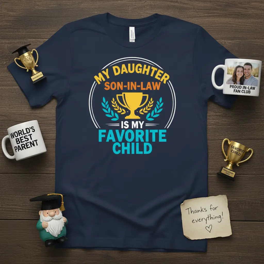 This unique t-shirt is designed for parents who have a special place in their hearts for their daughter and her partner. The clear, impactful text combined with the celebratory trophy graphic makes a statement that is both funny and heartwarming. It’s more than just apparel; it’s a wearable declaration of love and appreciation for your son-in-law, acknowledging him as your favorite child.