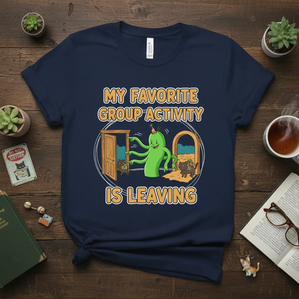 My Favorite Group Activity Is Leaving is more than just a slogan; it’s a declaration of independence for the socially selective and a humorous anthem for introverts everywhere. This t-shirt speaks to the soul of anyone who has ever felt the overwhelming urge to slip away from a crowded room or a lengthy social engagement. It celebrates the quiet joy found in solitude and the sheer relief that comes with an exit strategy, making it a relatable and witty addition to any wardrobe.