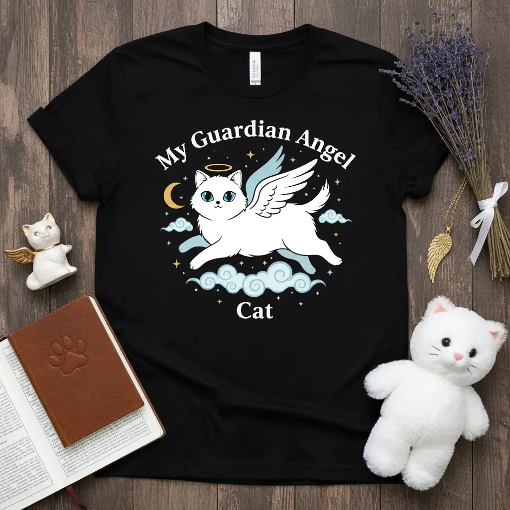 The phrase “My Guardian Angel Cat” is elegantly presented, making a clear and heartfelt statement about the wearer’s bond with their pet. This design is ideal for anyone who believes their cat possesses a special, protective spirit and brings a touch of heaven into their everyday life.