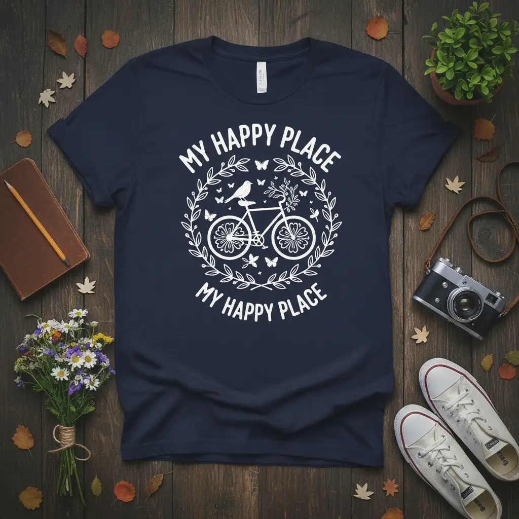 My Happy Place My Happy Place is more than just a phrase; it’s a feeling, an experience, and for many, a lifestyle. This t-shirt embodies that sentiment, celebrating the joy and freedom found in your personal sanctuary, especially when it involves the open road or a scenic trail. It’s designed for those who understand that true happiness can be as simple as a bicycle ride, surrounded by the beauty of nature. Wear your happy place proudly and inspire others to find theirs.