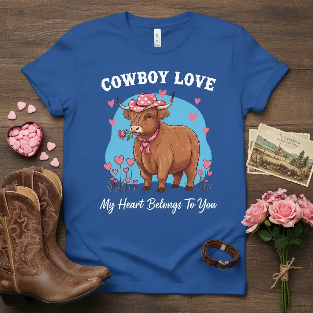 This isn’t just a t-shirt; it’s a wearable piece of art that celebrates love in a unique and memorable way. The “Cowboy Love” theme combined with the Highland cow graphic creates a memorable image that resonates with warmth and affection. It’s an ideal way to express your feelings, making every day feel a little more romantic and special. Embrace the spirit of love and country charm with this delightful tee. Order yours today and share your heart!