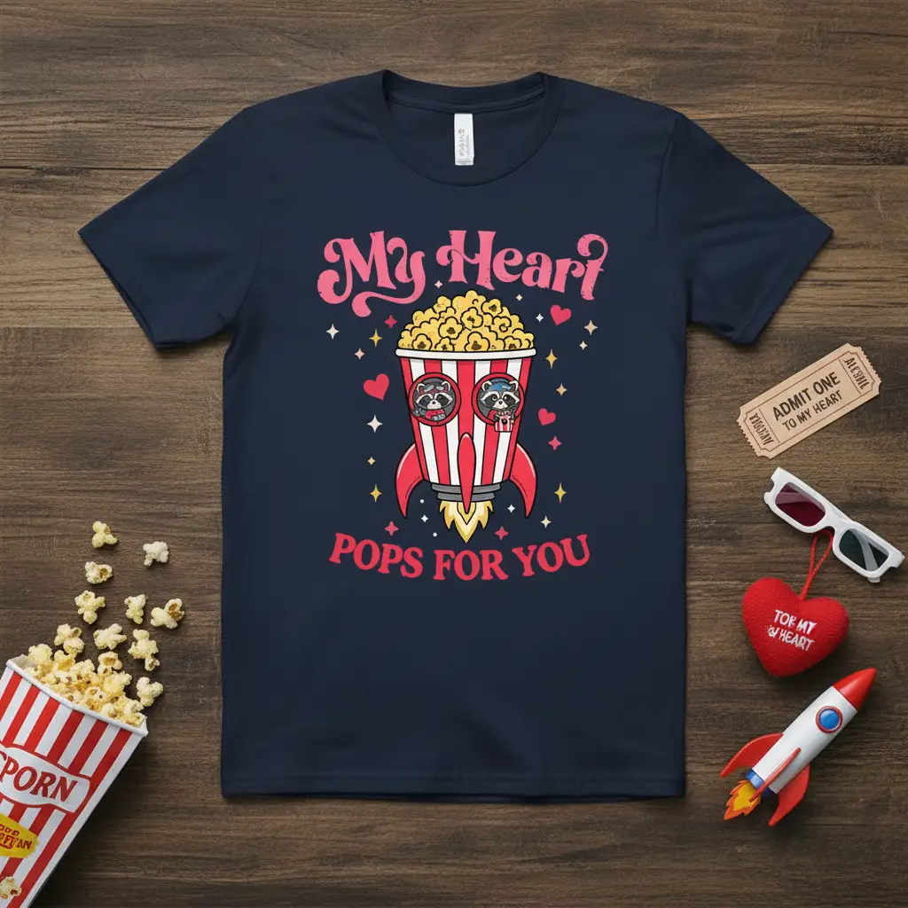 My Heart? POPS FOR YOU T-Shirt is the perfect way to express your affection with a blend of playful charm and undeniable sweetness. This unique design features adorable raccoons piloting a rocket ship overflowing with delicious popcorn, capturing the excitement of love in a truly memorable way. It’s an ideal garment for anyone looking to add a touch of whimsy and romance to their wardrobe or to surprise a loved one with a gift that’s both heartfelt and fun. The vibrant graphics and catchy slogan make this tee a standout piece for any occasion, especially Valentine’s Day.