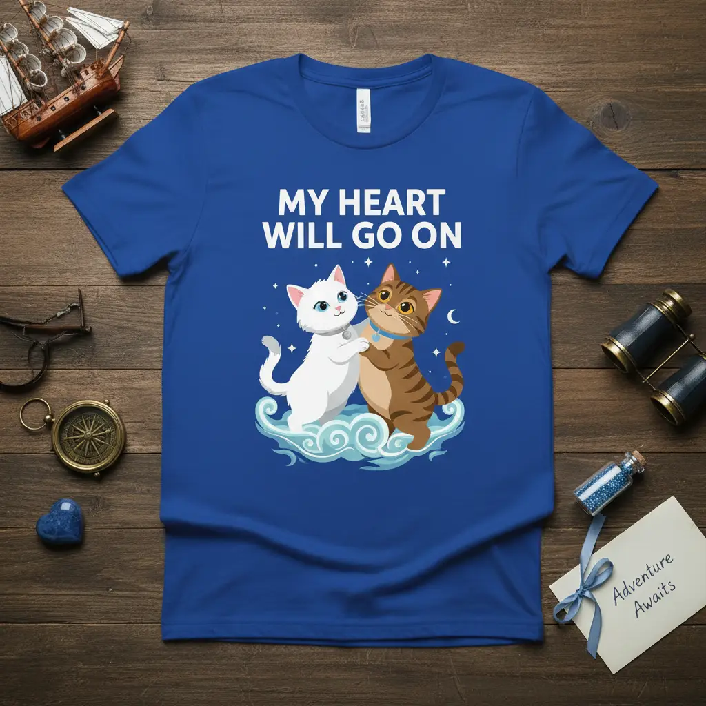 This t-shirt features the touching phrase “MY HEART WILL GO ON” prominently displayed above an adorable illustration of two cats. The design showcases a pristine white cat with captivating blue eyes nuzzling closely with a striped tabby cat, complete with a charming blue collar. They are depicted together on soft, fluffy clouds, set against a backdrop of twinkling stars and a gentle crescent moon. This visual narrative speaks volumes about deep affection and the unbreakable bonds we share.