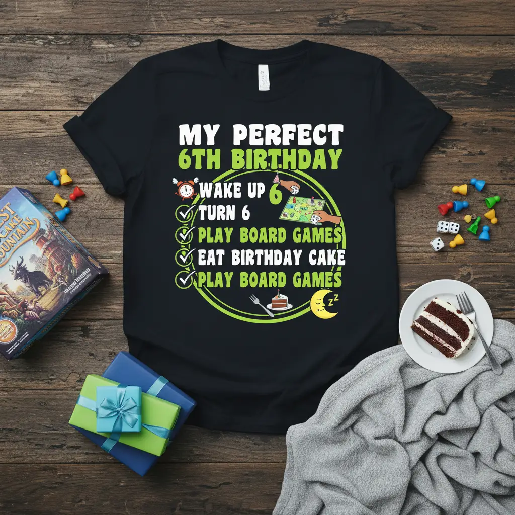 Don’t miss out on making this 6th birthday truly unforgettable. This “MY PERFECT 6TH BIRTHDAY” t-shirt is designed to bring smiles, laughter, and excitement to the celebration. It’s the perfect way to commemorate this special age and a cherished memory for years to come. Click “Add to Cart” now and get ready for a birthday filled with board games, cake, and pure joy!