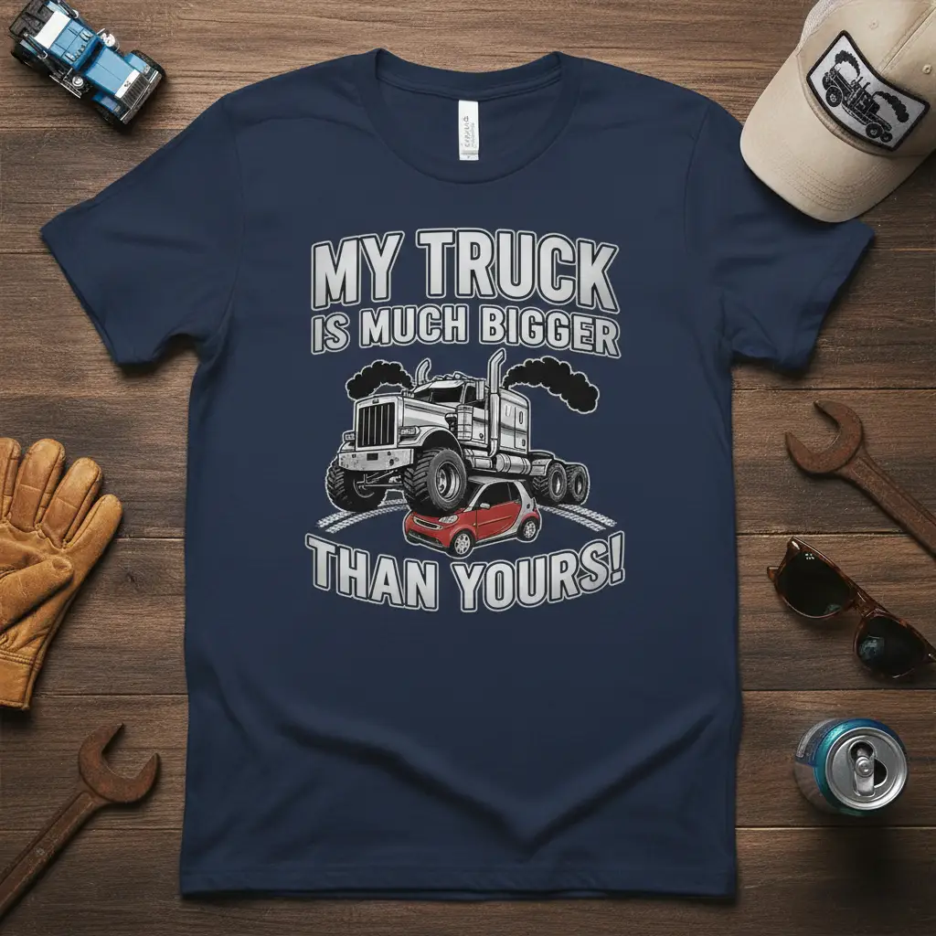 MY TRUCK IS MUCH BIGGER THAN YOURS! This iconic phrase perfectly encapsulates the bold spirit and impressive presence of any truck enthusiast. Designed for those who appreciate the power and scale of their beloved vehicles, this t-shirt is more than just apparel; it’s a declaration of pride and a nod to the camaraderie within the trucking community. The striking graphic, featuring a colossal semi-truck dominating a miniature car, visually communicates this powerful sentiment. It’s a conversation starter, a badge of honor, and a comfortable addition to any wardrobe. Whether you’re on the road or off, this tee lets you showcase your passion for all things truck.