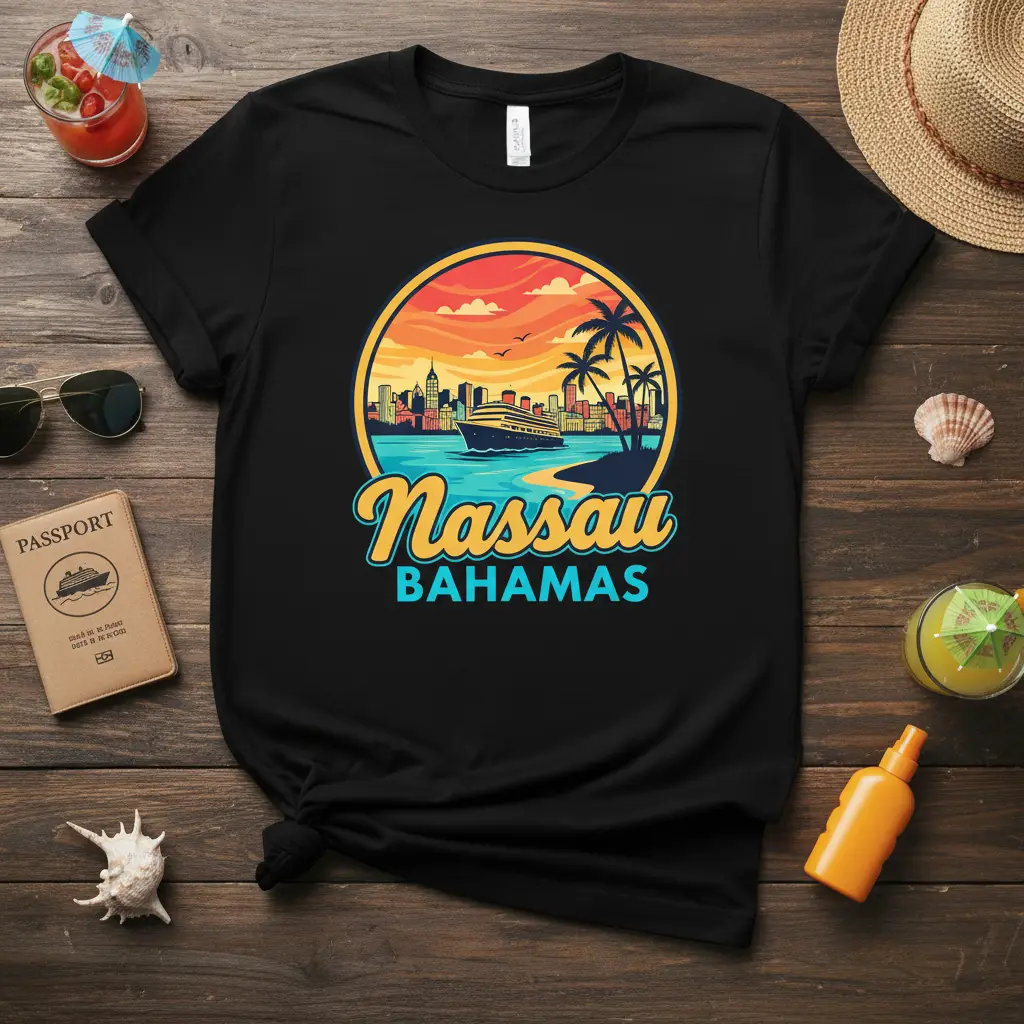 The design proudly showcases the text “Nassau BAHAMAS,” instantly recognizable to anyone who has visited or longs to visit this paradise. It’s more than just apparel; it’s a statement of your wanderlust and appreciation for the unique charm of this popular cruise port. Whether you’re exploring the local markets or relaxing on the beach, this tee adds a touch of tropical flair to your outfit.