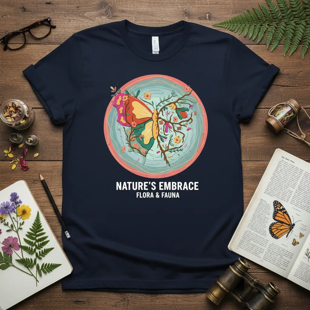 This captivating design encapsulates the essence of nature’s artistry, blending the delicate form of a butterfly with the organic beauty of flora and fauna. The wings of the butterfly are intricately depicted as flourishing branches, adorned with colorful flowers and lush leaves, symbolizing growth and the cycle of life. The accompanying text, “NATURE’S EMBRACE FLORA & FAUNA,” reinforces the theme, inviting wearers to connect with and cherish the natural world around them.