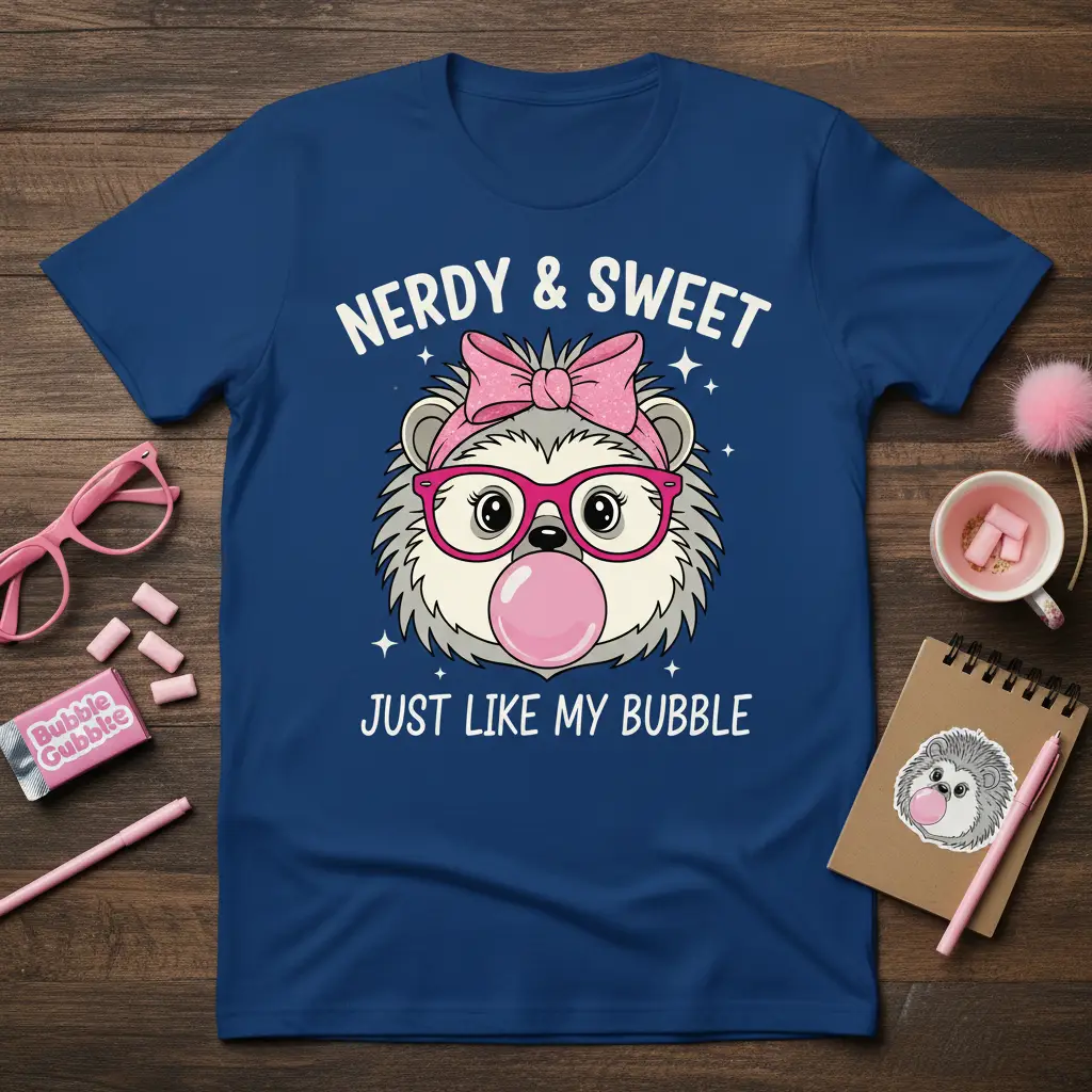 NERDY & SWEET JUST LIKE MY BUBBLE is more than just a phrase; it’s a declaration of playful personality captured on this charming t-shirt. This design features an adorable hedgehog, complete with pink glasses and a sparkly bow, blowing a large bubblegum bubble. It perfectly encapsulates a blend of intelligence and sweetness, making it an ideal statement piece for anyone who appreciates unique and quirky apparel. The vibrant graphic is sure to bring a smile to your face and those around you.