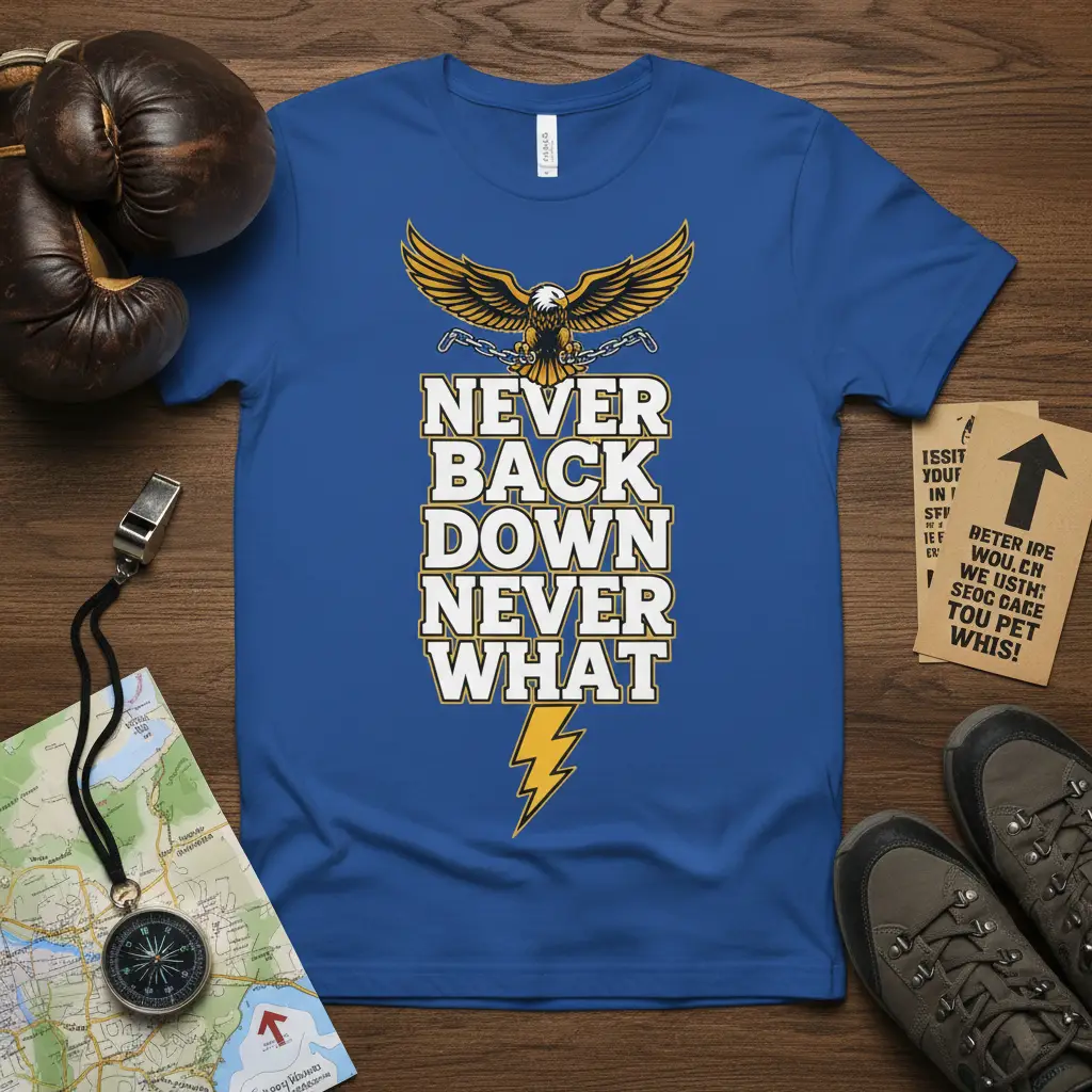Never Back Down Never What emblazoned on this vibrant blue t-shirt serves as a powerful anthem for resilience and unwavering determination. This design is more than just apparel; it’s a declaration of intent for those who face challenges head-on and refuse to surrender. Featuring a bold eagle graphic, symbolizing strength and freedom, and a dynamic lightning bolt, representing power and impact, this shirt is crafted to inspire and motivate. It’s perfect for athletes, fighters, adventurers, or anyone who believes in pushing their limits and never giving up on their dreams. Wear it as a constant reminder of your inner strength and commitment.