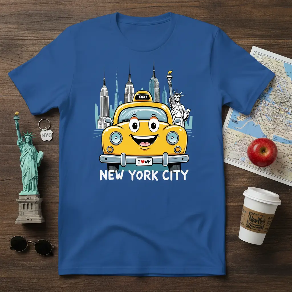 Celebrate your love for the Big Apple with this charming New York City taxi t-shirt. Featuring a fun, cartoonish yellow cab against the iconic skyline, this tee is perfect for tourists and proud New Yorkers. Made for comfort and style, it makes an excellent souvenir or gift.