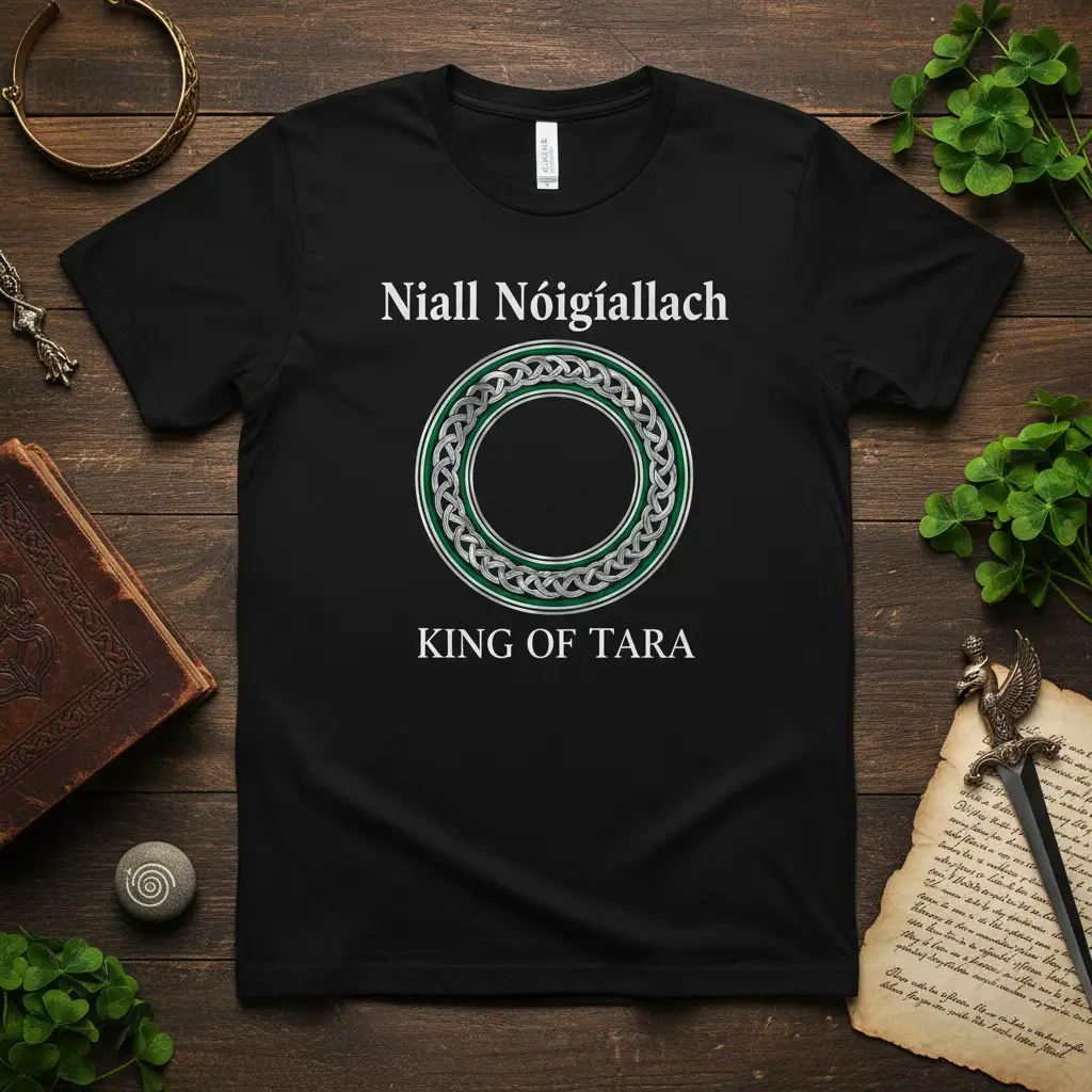 The text “Niall Nóigiállach KING OF TARA” emblazoned on this shirt signifies more than just a name; it represents a pivotal figure in Irish history. Niall Nóigiállach, often known as Niall of the Nine Hostages, was a legendary High King of Ireland during the 4th and 5th centuries. His reign is a cornerstone of Irish lore and historical narratives, making this t-shirt a piece of wearable history.