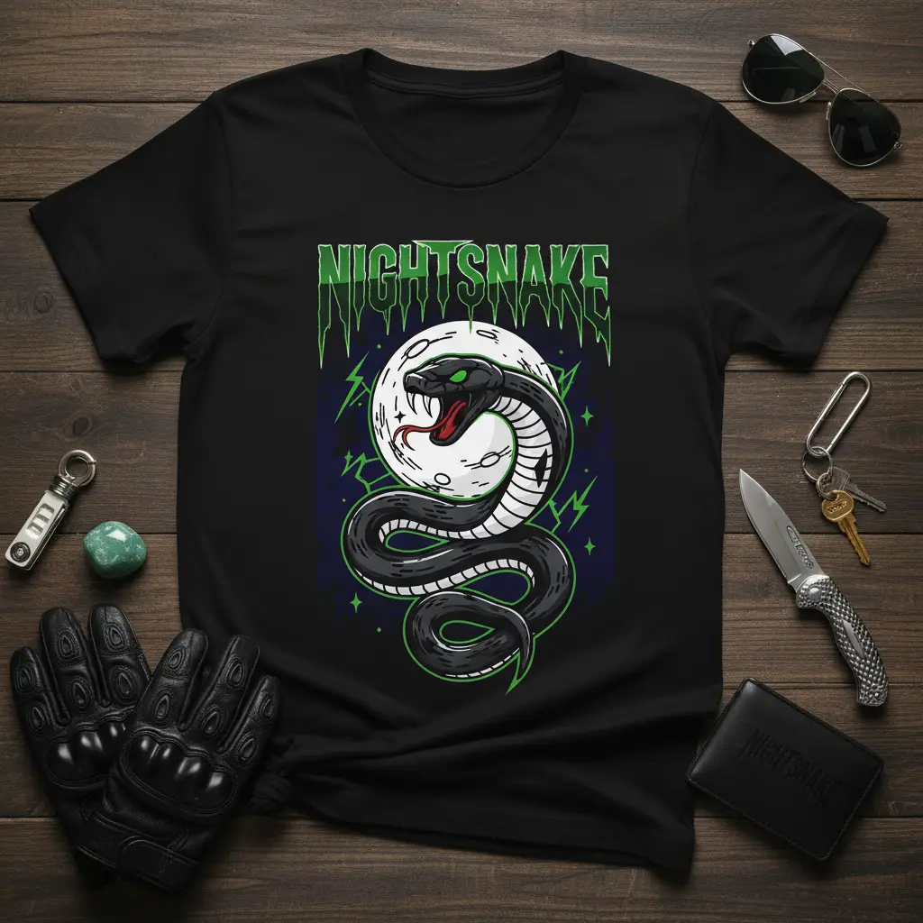 The artistry behind the NIGHTSNAKE t-shirt is undeniable, drawing you into a world of nocturnal wonder. A sleek, black serpent dominates the design, its form gracefully wrapping around a radiant full moon. The contrast between the dark snake and the bright moon creates a dramatic focal point, enhanced by vibrant green lightning bolts and subtle star accents that add an electric, mystical aura. This design is perfect for anyone who finds beauty in the shadows and power in the night.