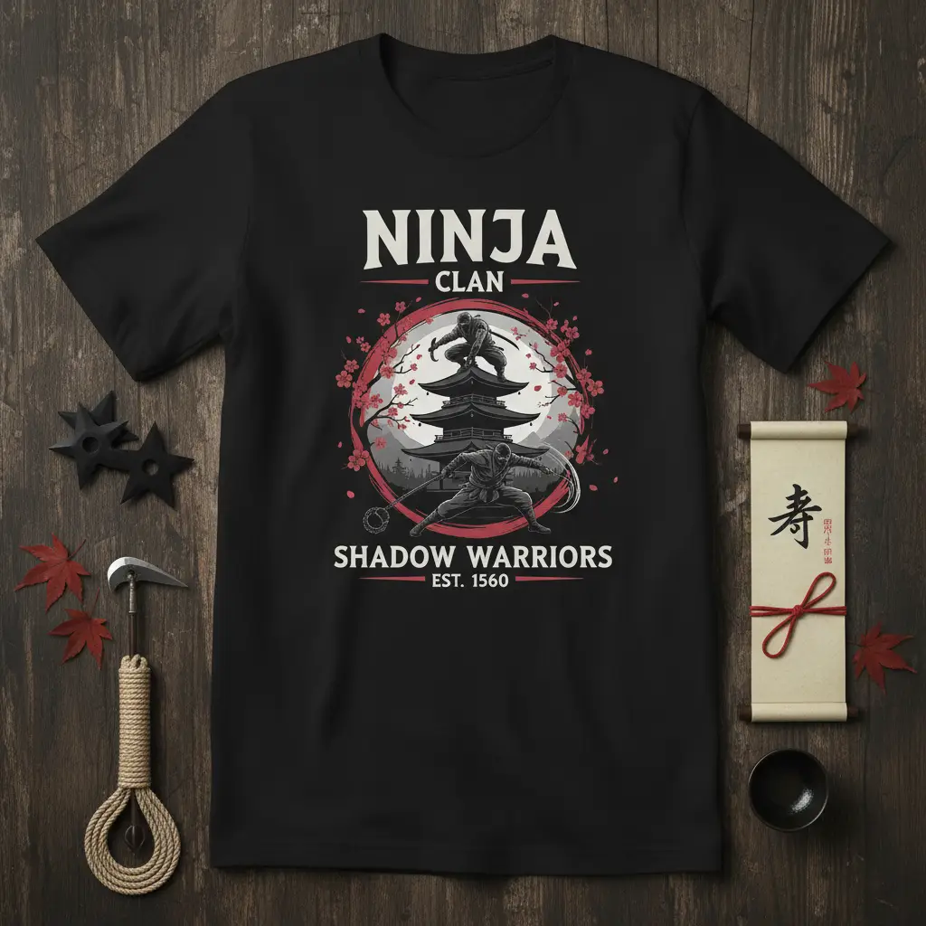 The intricate artwork on this shirt brings the concept of “NINJA CLAN SHADOW WARRIORS EST. 1560” to the forefront. The ninjas are depicted with dynamic poses, showcasing their agility and readiness, while the traditional pagoda stands as a symbol of their historical domain. The surrounding cherry blossoms add a touch of ephemeral beauty, often associated with Japanese aesthetics and the fleeting nature of life, a concept that resonates with the ninja’s clandestine existence.