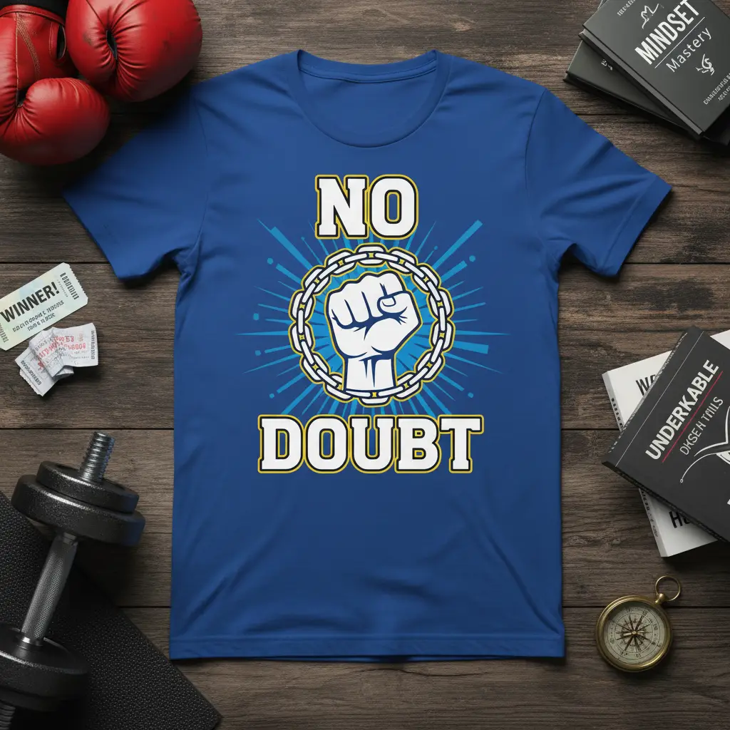 The visual elements of this shirt are carefully chosen to convey a message of resilience and strength. The chain symbolizes the bonds you break and the unbreakable spirit you possess, while the fist represents your power and readiness to take action. Coupled with the vibrant blue sunburst, it creates a look that is both energetic and inspiring, perfect for motivating yourself and those around you. This NO DOUBT design embodies the core principles of dedication and perseverance required for any fitness endeavor.