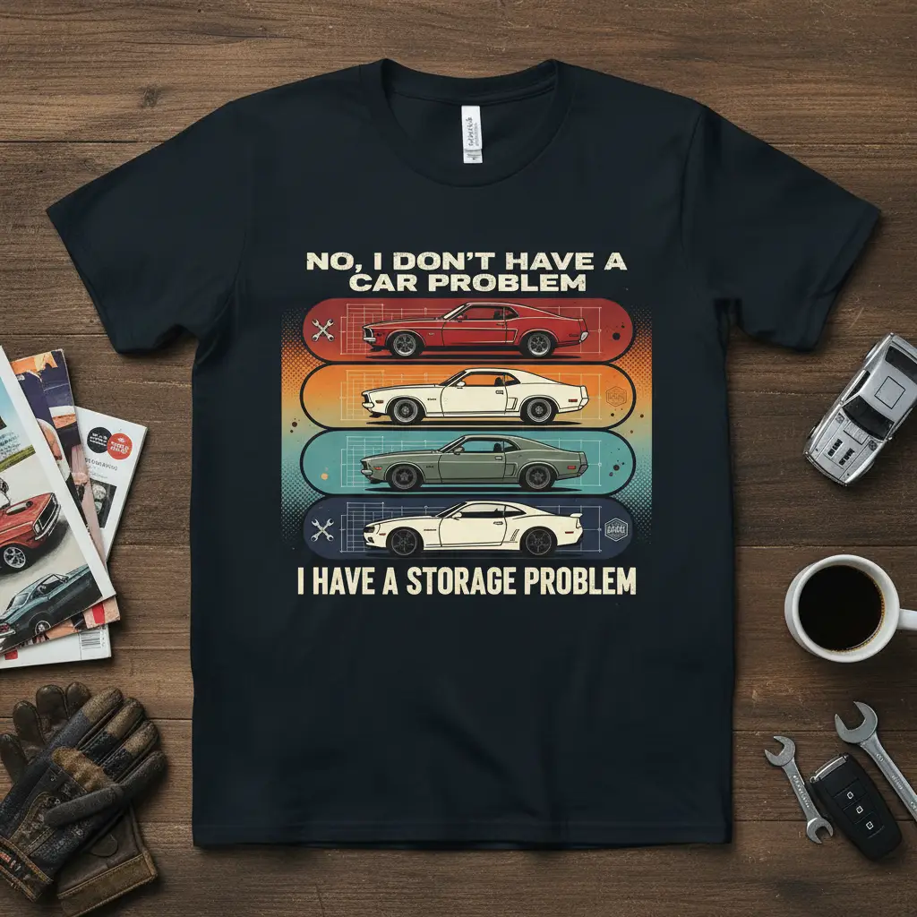 This shirt is more than just clothing; it’s a conversation starter that connects you with fellow car lovers. It embodies the spirit of the automotive community, where shared passions and understanding challenges create strong bonds. Wear it with pride and let the world know about your delightful “storage problem.”