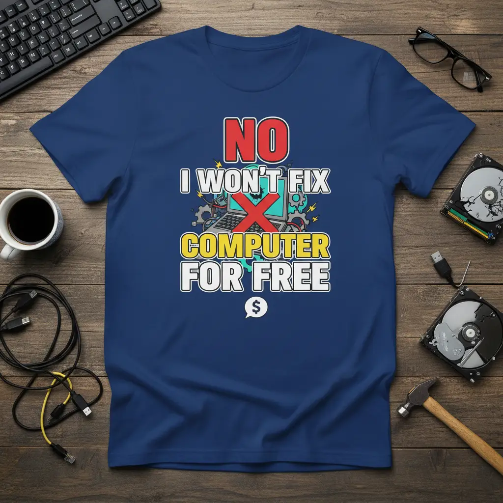 NO I WON’T FIX COMPUTER FOR FREE is the ultimate declaration for anyone in the tech world who’s tired of being the go-to person for unsolicited computer help. This t-shirt isn’t just apparel; it’s a statement piece that speaks volumes about valuing your time and expertise. Designed for IT professionals, computer repair technicians, and even hobbyists who know their worth, this shirt is a humorous yet clear way to set boundaries. It’s crafted for comfort and durability, ensuring you can wear your professional pride with style and a chuckle.