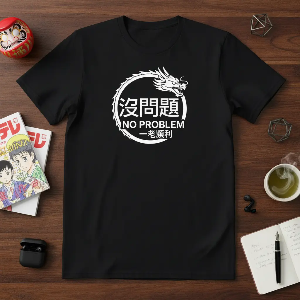 This unique tee features the phrase “No Problem” prominently displayed, surrounded by intricate Japanese characters and a majestic dragon. The dragon, a symbol of power, strength, and good fortune in East Asian cultures, adds a layer of depth and mystique to the design. The accompanying Japanese text, “沒問題” and “一老順利,” further emphasizes the sentiment of effortless problem-solving and smooth sailing through life’s journey.