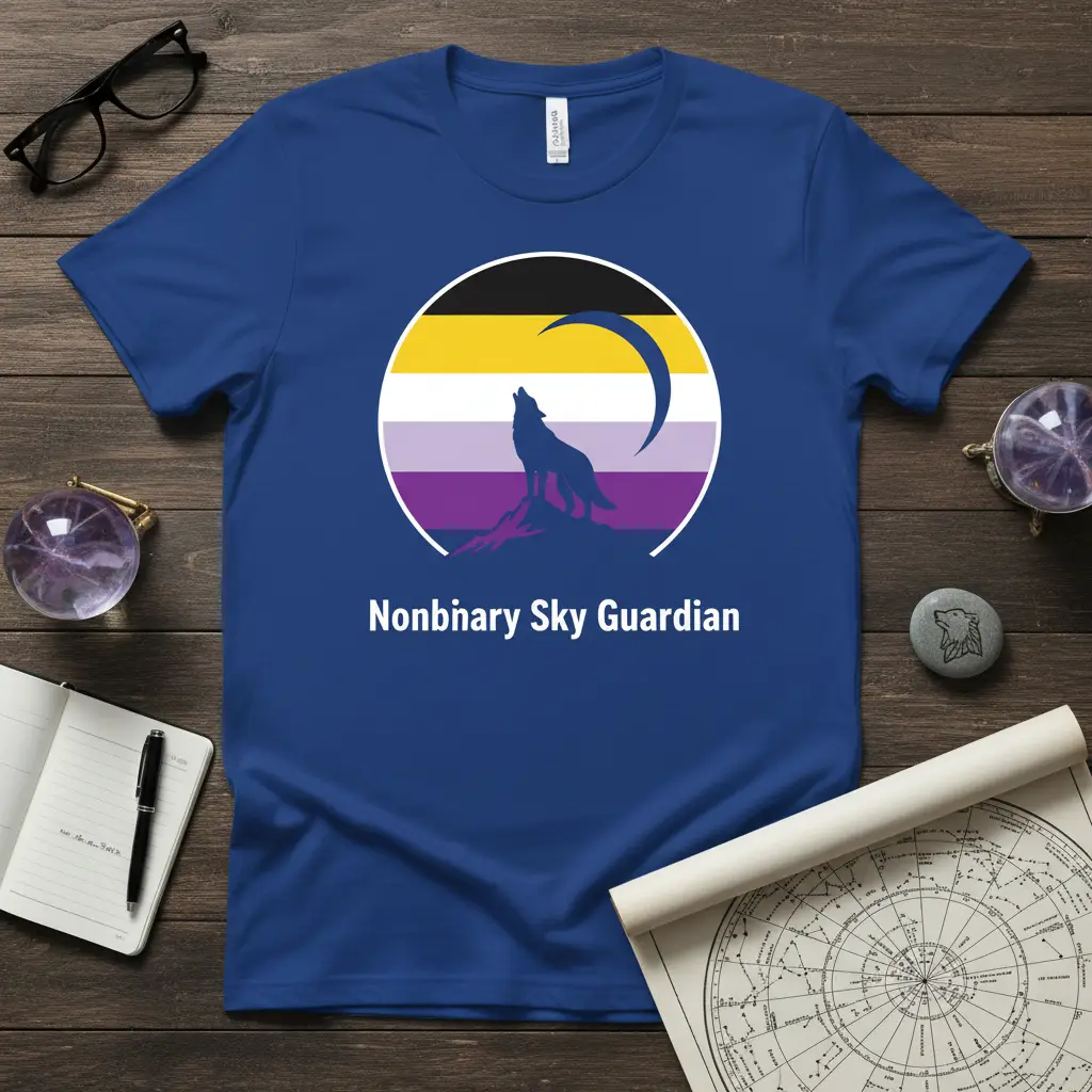 This Nonbinary Sky Guardian t-shirt is designed for those who wish to showcase their nonbinary pride with a touch of mystique. The graphic features a majestic wolf silhouetted against a crescent moon, set within a circular emblem. This emblem beautifully incorporates the black, yellow, white, and purple stripes of the nonbinary pride flag. It represents strength, vigilance, and the unique beauty of the nonbinary identity.