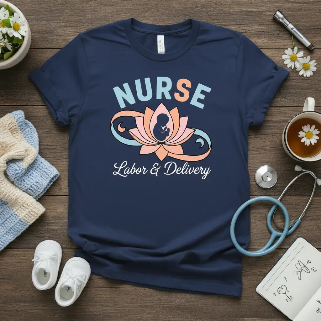 This comfortable and stylish Nurse Labor & Delivery t-shirt is designed for those who dedicate their lives to caring for mothers and newborns. The unique graphic combines elegant typography with a symbolic lotus flower, representing growth, purity, and new life. It’s an ideal way for nurses to express their professional identity and passion for their work.