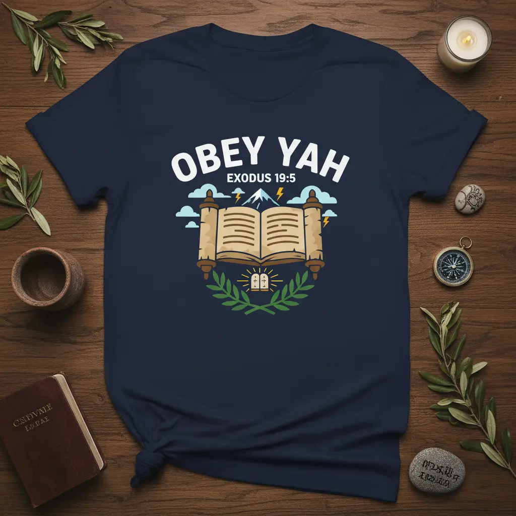 This distinctive t-shirt prominently displays “OBEY YAH” in bold, white lettering, accompanied by the significant biblical reference “EXODUS 19:5.” The central graphic is an elegantly unfurled scroll, symbolizing divine scripture, which rests upon a wreath of green leaves. This visual motif is further enhanced by a backdrop featuring majestic mountains, swirling clouds, and dramatic lightning strikes, evoking the powerful events described in Exodus. At the base of the scroll, a representation of the Ten Commandments reinforces the message of obedience and divine law. It’s a design that speaks volumes to those seeking to honor their faith through their attire.