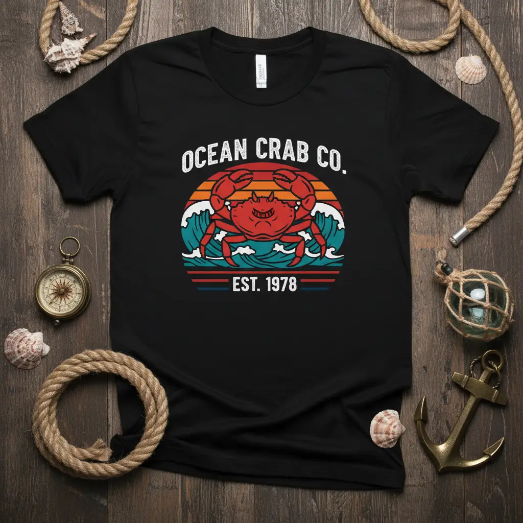 This t-shirt features an eye-catching graphic that embodies the spirit of the ocean. The central element is a vibrant red crab, rendered in a classic retro style that evokes a sense of nostalgia and adventure. It is set against a backdrop of stylized blue waves and a striking sunset with bold orange, yellow, and red bands. The text “OCEAN CRAB CO.” arches gracefully above the illustration, while “EST. 1978” is clearly marked below, grounding the design with a vintage establishment date.