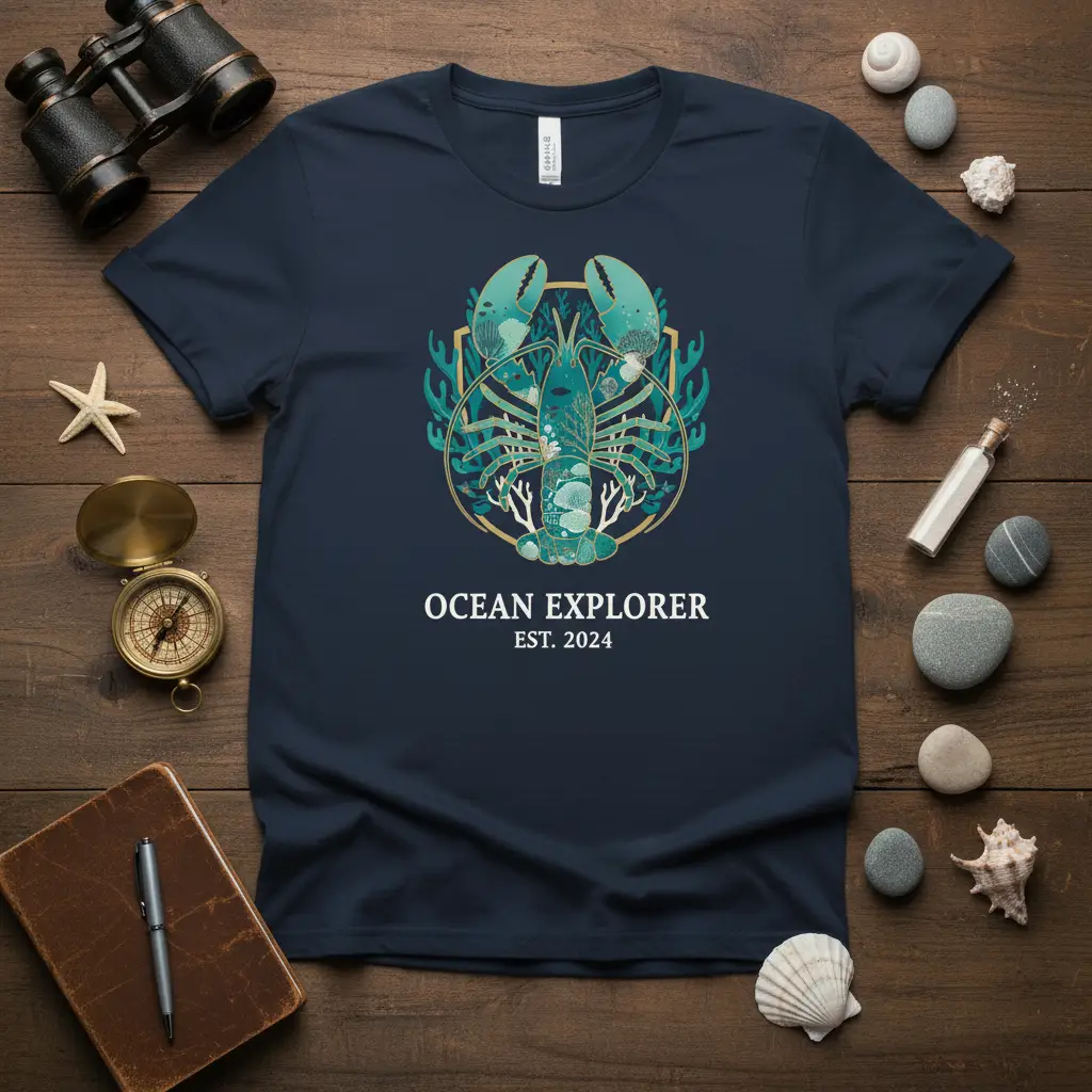 This t-shirt is more than just apparel; it’s a statement of your connection to the marine world. The detailed lobster graphic, set against a backdrop of coral and sea elements, is rendered in stunning teal and gold hues. The “OCEAN EXPLORER EST. 2024” text adds a personalized touch, marking a year of discovery or a lifelong passion. It’s perfect for beach days, sailing trips, or simply relaxing while dreaming of the sea.