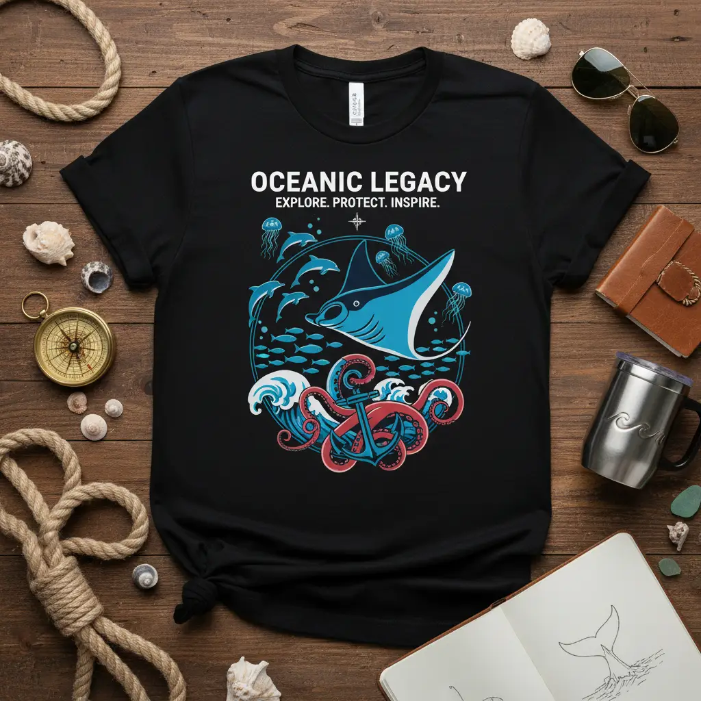 This t-shirt proudly displays the “OCEANIC LEGACY. EXPLORE. PROTECT. INSPIRE.” motto, encouraging a mindful approach to our planet’s blue heart. The captivating design features a magnificent manta ray gliding through the water, accompanied by playful dolphins and a school of shimmering fish. An artistic depiction of an octopus entwined with an anchor adds a touch of nautical mystique, while delicate jellyfish float gracefully. This visual narrative celebrates the diverse life within our oceans and the importance of preserving their natural state.