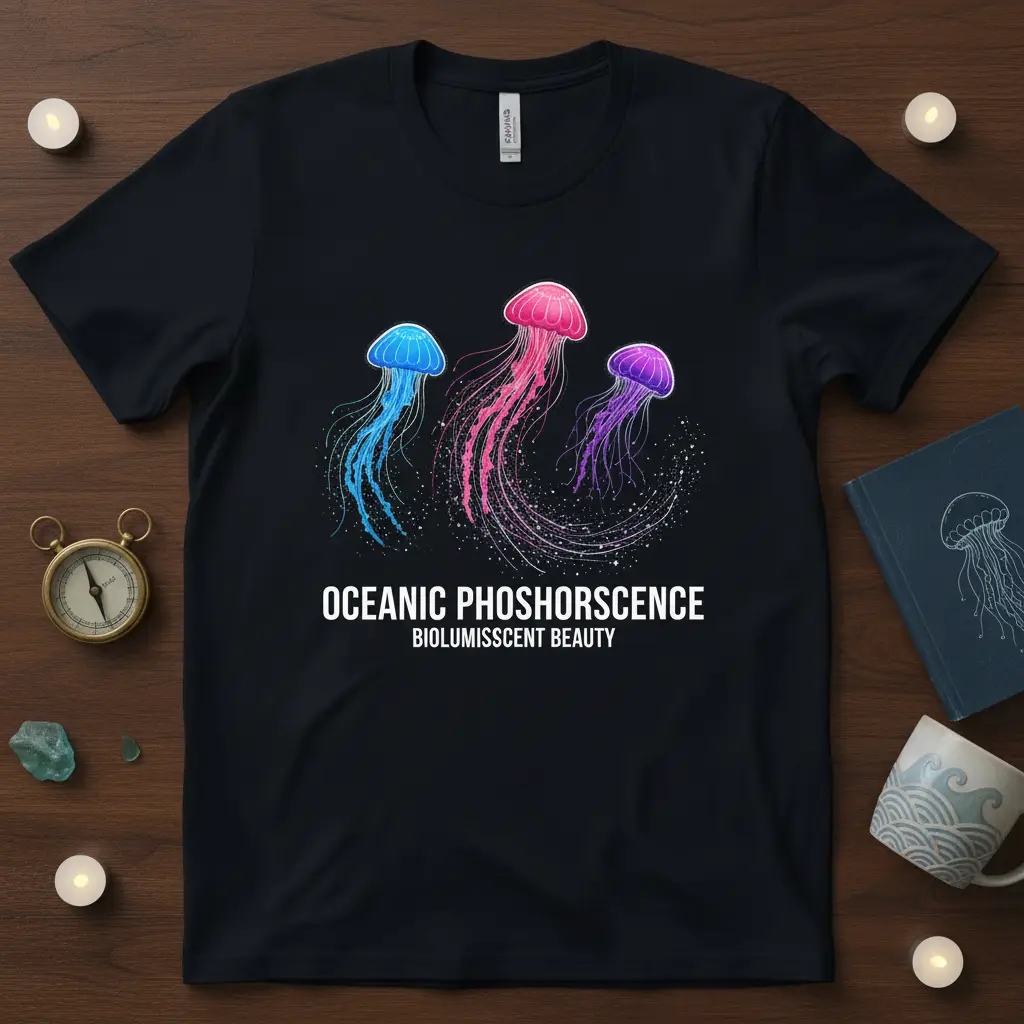 The “Bioluminescent Beauty” text on the shirt is a direct nod to the natural light show that occurs beneath the waves. These glowing jellyfish are not only visually stunning but also play a crucial role in their ecosystem. This Oceanic Phosphorescence Bioluminescent Beauty design serves as a reminder of the importance of ocean conservation and the incredible biodiversity it holds.