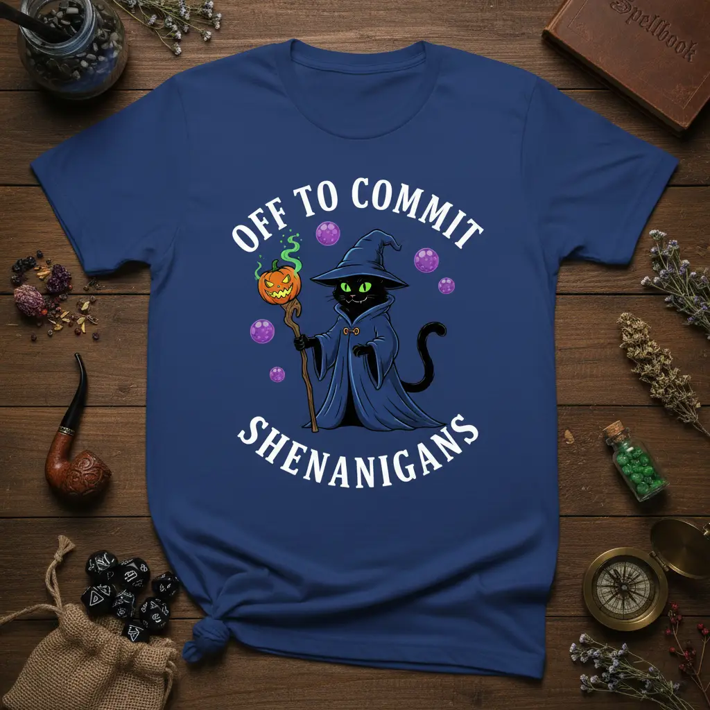 The bold white text, “OFF TO COMMIT SHENANIGANS,” arches above and below the illustration, making a clear and humorous statement. This phrase perfectly encapsulates the fun and lighthearted chaos associated with Halloween, making it an ideal wear for any festive occasion. The combination of the cute yet mysterious cat and the witty slogan creates a truly memorable and eye-catching garment.