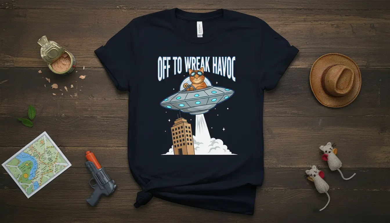 The concept of a cat taking to the stars in a UFO to cause a bit of mayhem is inherently humorous and imaginative. This OFF TO WREAK HAVOC design captures that spirit perfectly, with the cat exuding an air of cool confidence as it embarks on its mission. The attention to detail in the cartoonish UFO and the building below adds to the overall charm and appeal of the graphic.