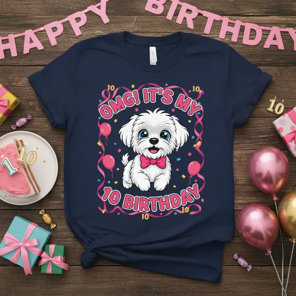 This vibrant tee proudly proclaims “OMG! IT’S MY 10 BIRTHDAY” in a playful, festive font that’s sure to grab attention. The centerpiece is a super-cute Maltese dog, complete with big, bright eyes and a charming pink bow tie, adding an extra layer of sweetness to the design. It’s the perfect way for any birthday girl to express her excitement and announce her tenth birthday to the world.