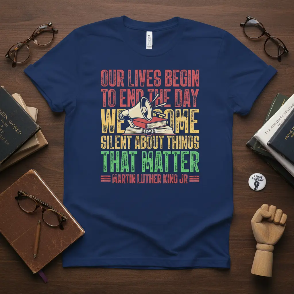 Our Lives Begin To End The Day We Become Silent About Things That Matter Martin Luther King Jr. This powerful quote from the legendary civil rights leader serves as a profound reminder of the importance of activism and speaking truth to power. This t-shirt is more than just apparel; it’s a wearable statement of conviction, designed for those who believe in standing up for what is right. The vintage-inspired design features bold typography and symbolic graphics, making it a compelling piece for any wardrobe.