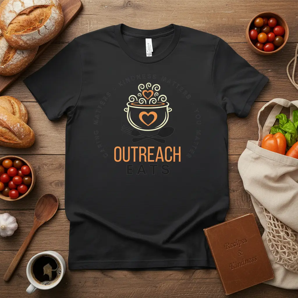 The graphic itself is a charming representation of nourishment and warmth. A stylized pot, emitting delightful swirls and a prominent heart, symbolizes the love and care poured into every act of outreach. Below it, a fork and spoon crossed elegantly suggest the act of sharing a meal. This thoughtful design captures the essence of what Outreach Eats stands for, making it a meaningful piece for anyone involved in charitable work or simply a believer in the power of kindness.