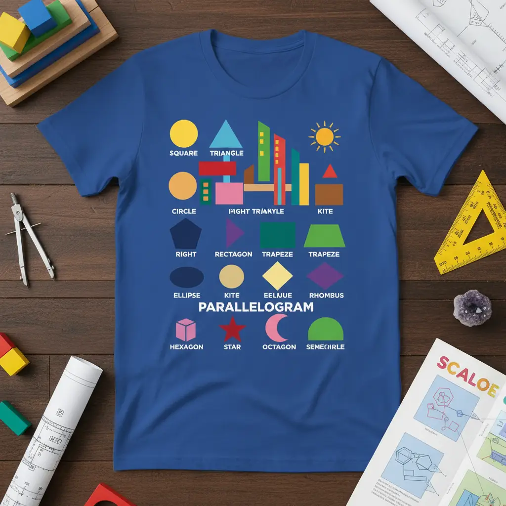 This t-shirt is a celebration of geometric forms, designed to be both educational and stylish. It features a meticulously curated collection of shapes, from the fundamental square and triangle to more complex figures like the rhombus and octagon. Each shape is accompanied by its correct name, presented in a clear and legible font, ensuring that learning is accessible and engaging for all ages.