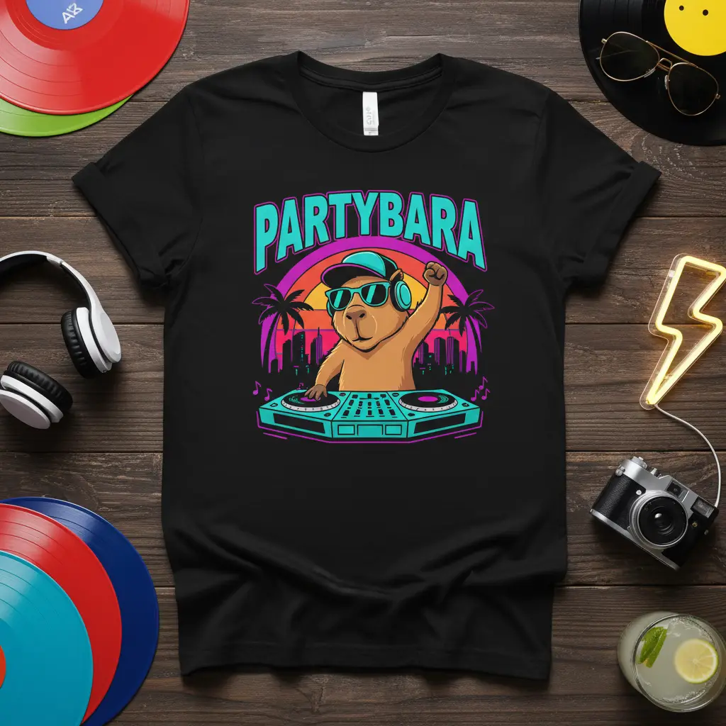 Step into the DJ booth with our fantastic PARTYBARA Capybara DJ T-Shirt. This design features a cool capybara sporting headphones and sunglasses, masterfully spinning on a set of turntables. The vibrant retro aesthetic, complete with palm trees and a city skyline at sunset, sets the mood for an unforgettable party experience.