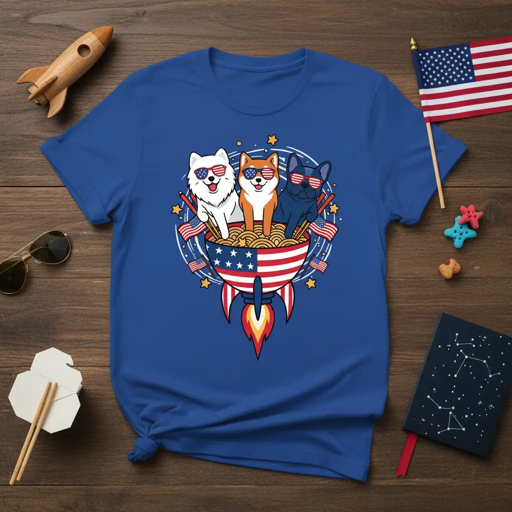 The appeal of this t-shirt lies in its originality and the sheer cuteness factor. The dogs featured – a fluffy Samoyed, a spirited Shiba Inu, and a charming French Bulldog – are rendered in a delightful cartoon style that appeals to all ages. The rocket noodle theme adds an unexpected and humorous twist, making it a memorable piece of clothing that stands out from the typical patriotic designs.