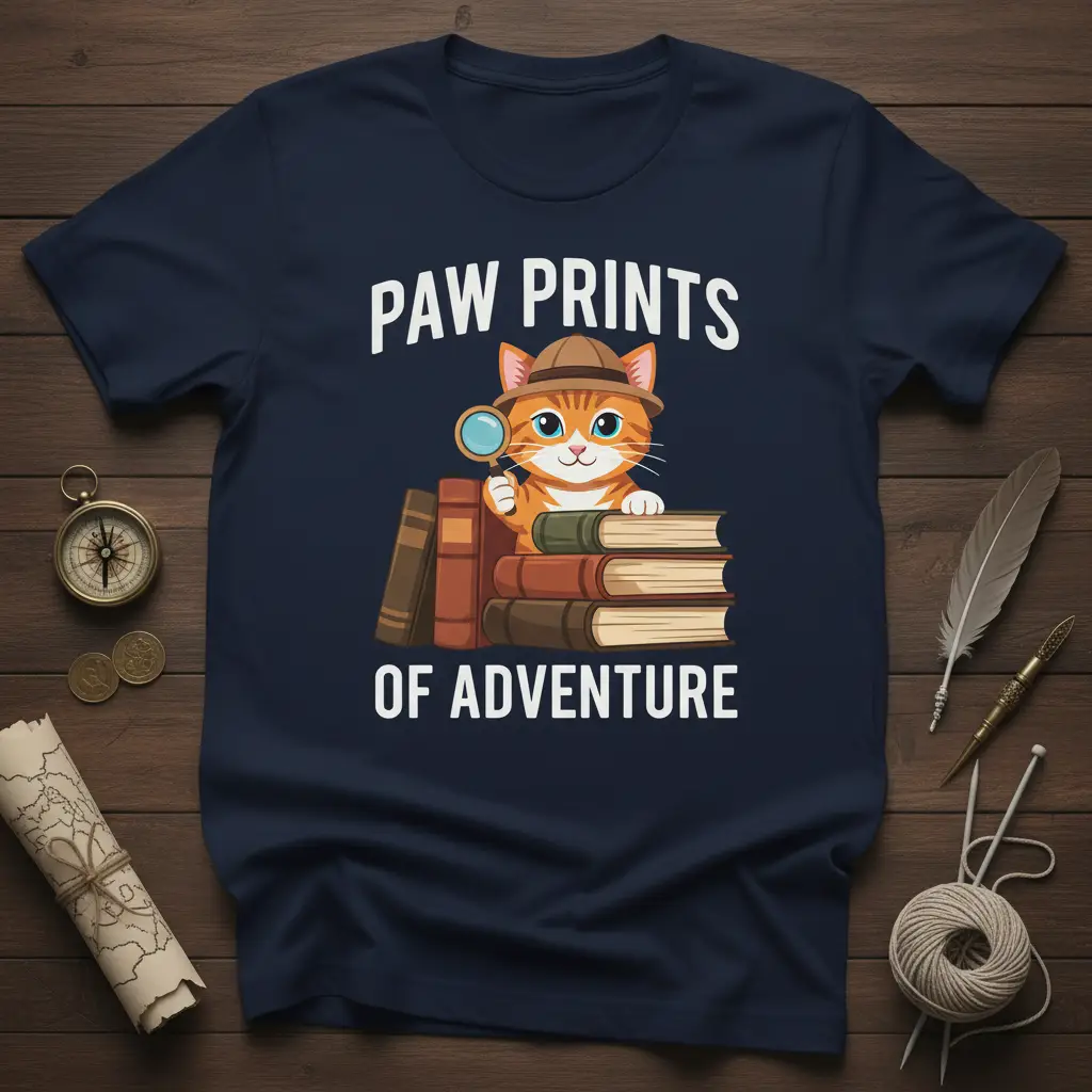 This Paw Prints Of Adventure t-shirt is designed for those who believe that every book is a gateway to a new world and that adventure can be found in the simplest of moments. The playful depiction of the cat with a magnifying glass symbolizes the joy of discovery and the thrill of uncovering hidden stories, much like a detective on a case. It’s a perfect way to express your personality and interests through your clothing.