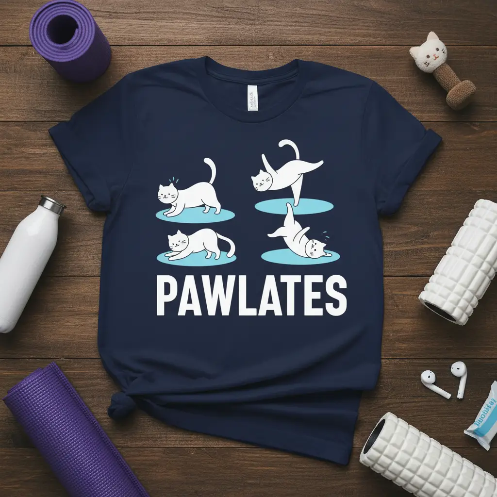 PAWlATES is more than just a clever pun; it’s a celebration of feline grace and the joy of movement, cleverly merged into a hilarious t-shirt design. This unique graphic tee brings together the worlds of cats and yoga, offering a playful and comfortable way to express your love for both. Whether you’re a seasoned yogi, a devoted cat parent, or simply someone who appreciates a good laugh, this shirt is designed to bring a smile to your face and spark conversations. Its witty design makes it an instant favorite for anyone looking to add a touch of personality and humor to their wardrobe. Embrace the purr-fect combination of fitness and feline fun with this must-have apparel.