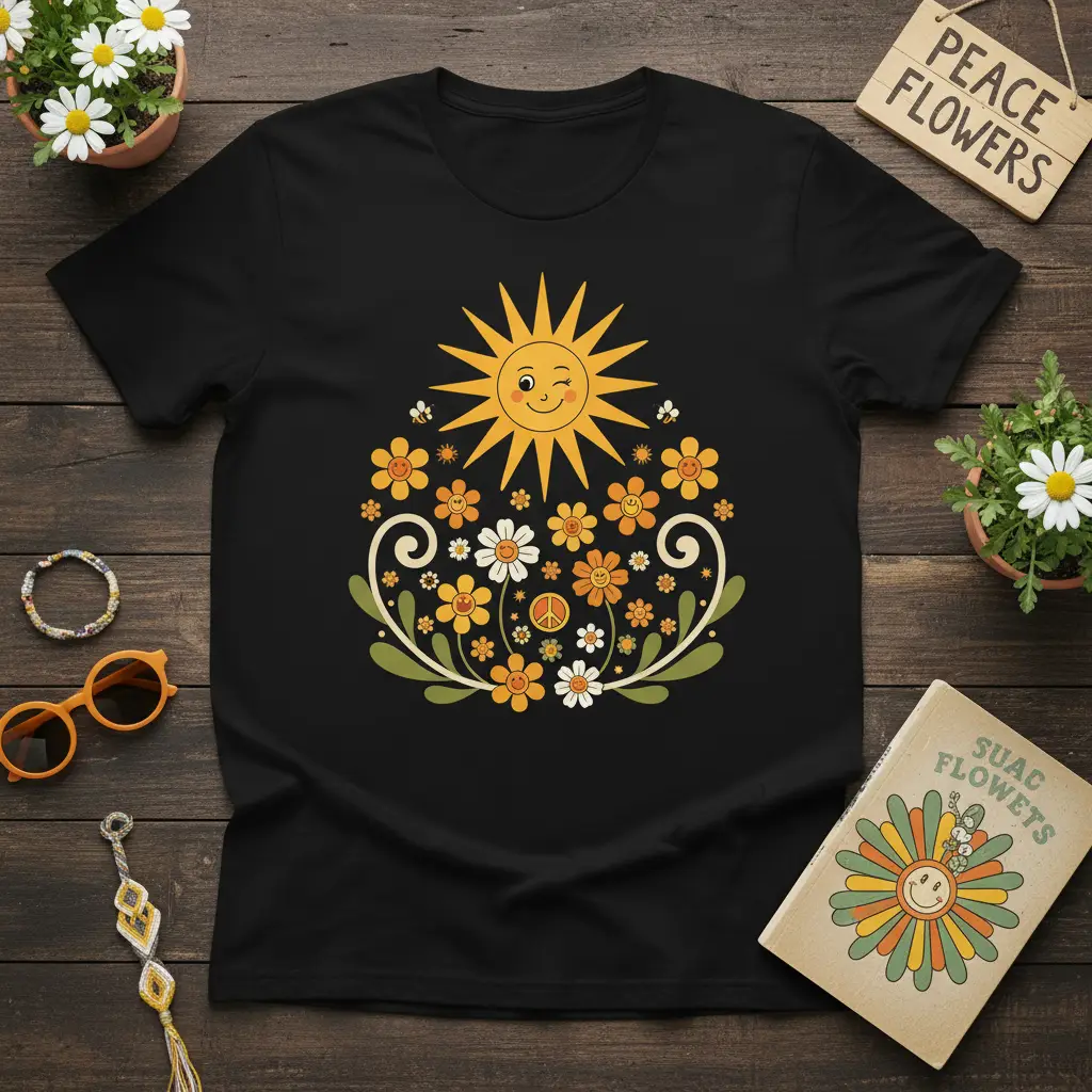 Peace Flowers captures the essence of a bygone era with its vibrant and nostalgic design, perfect for those who cherish the free-spirited vibes of the 1970s. This t-shirt is more than just apparel; it’s a statement of positivity and a celebration of nature’s beauty, rendered in a style that remains timeless. The cheerful sun, complete with a playful wink, is surrounded by a delightful arrangement of flowers and iconic peace symbols, creating a look that is both eye-catching and heartwarming. Its retro aesthetic makes it a standout piece for any wardrobe, inviting smiles and conversations wherever you go.