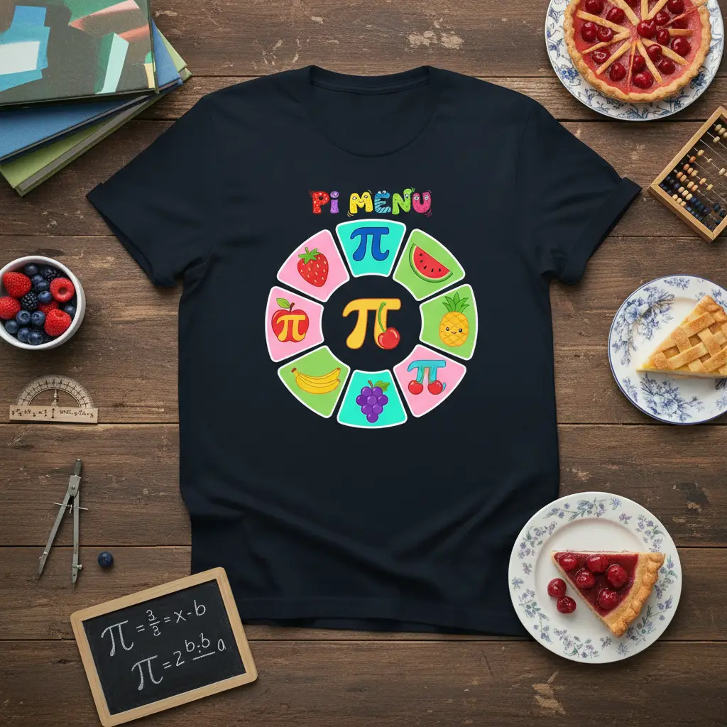 At the heart of this t-shirt is a creatively arranged “Pi Menu” graphic. A central Pi symbol is surrounded by a colorful wheel of popular fruits, each in its own segmented section. You’ll find juicy strawberries, refreshing watermelon slices, tropical pineapples, ripe bananas, plump grapes, and sweet cherries, all rendered in a charming, cartoonish style. The “Pi Menu” text itself is presented in a fun, whimsical font, adding to the overall playful and educational aesthetic of the design.